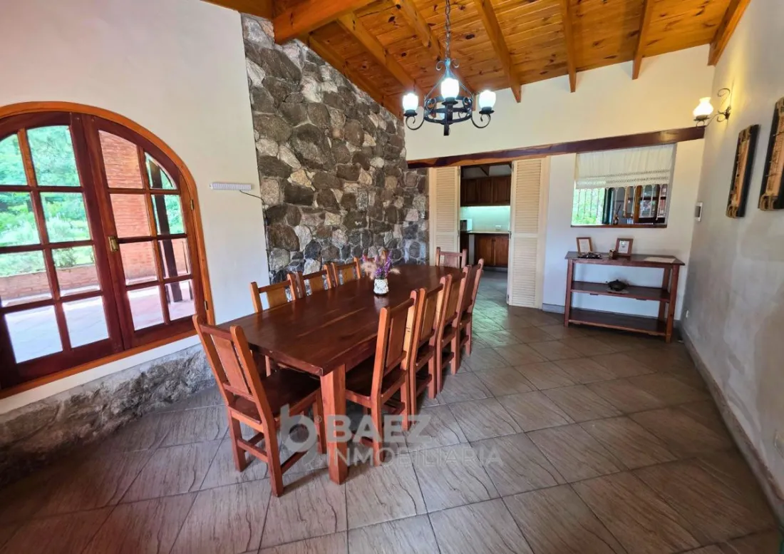 • Comedor amplio revestido en piedra y con hermosas ventanas de madera.